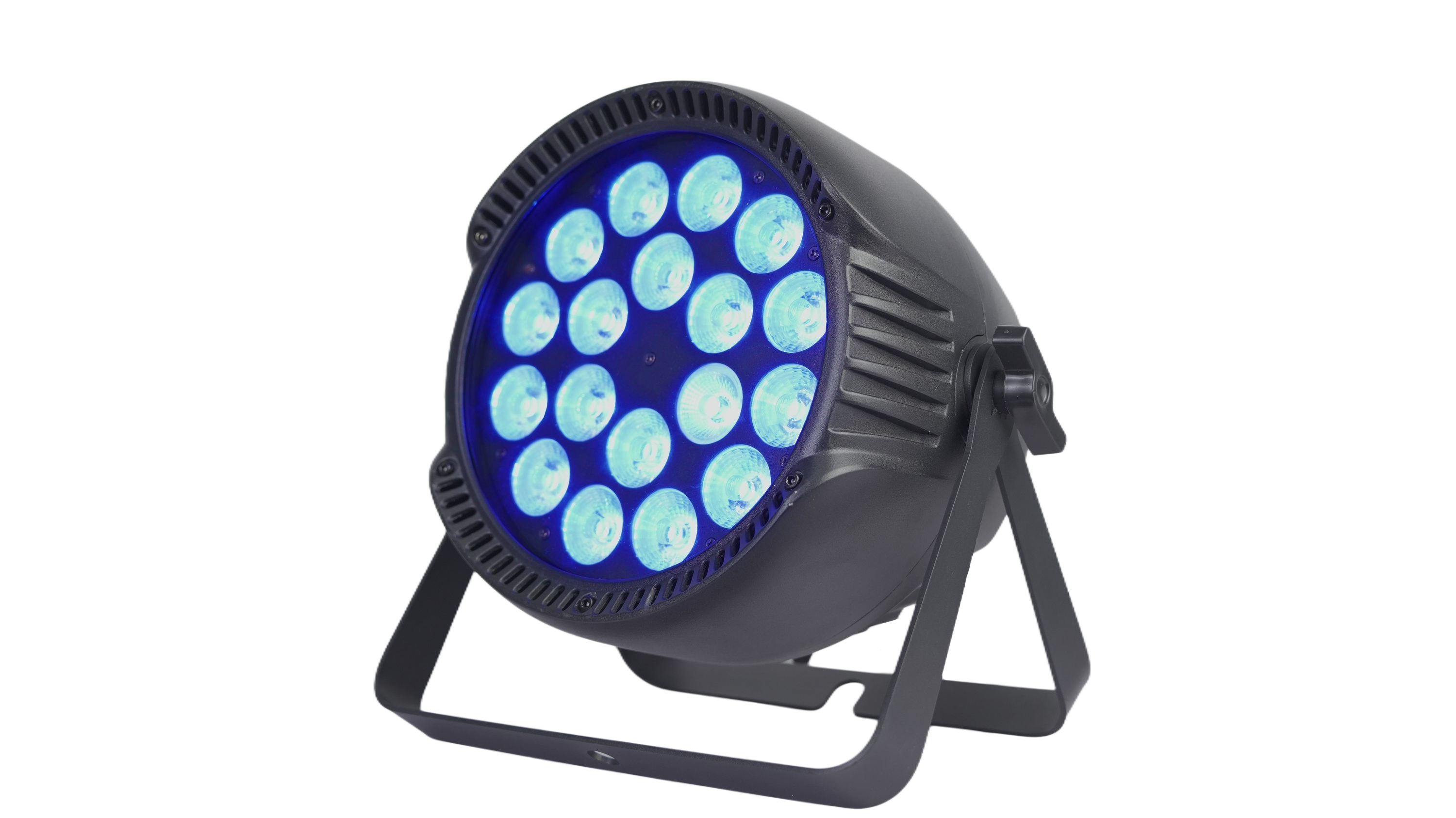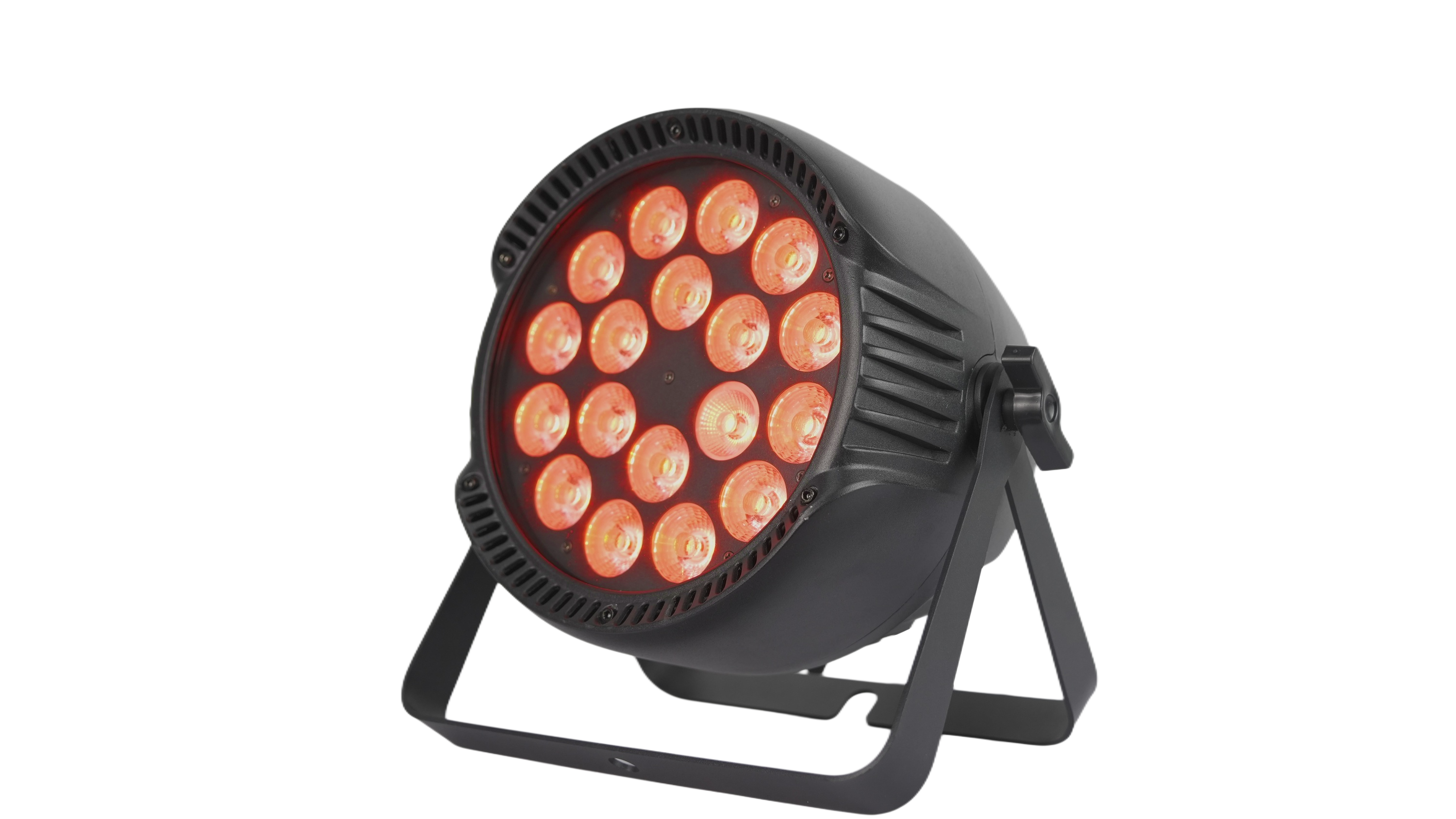 18 10W LEDs, high-brightness light source, multiple control modes, adjustable strobe, waterproof design suitable for outdoor use.
