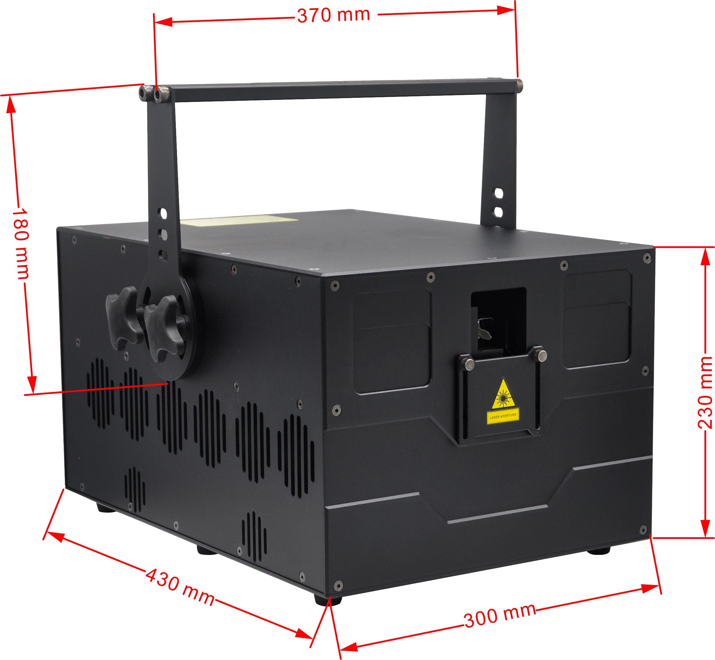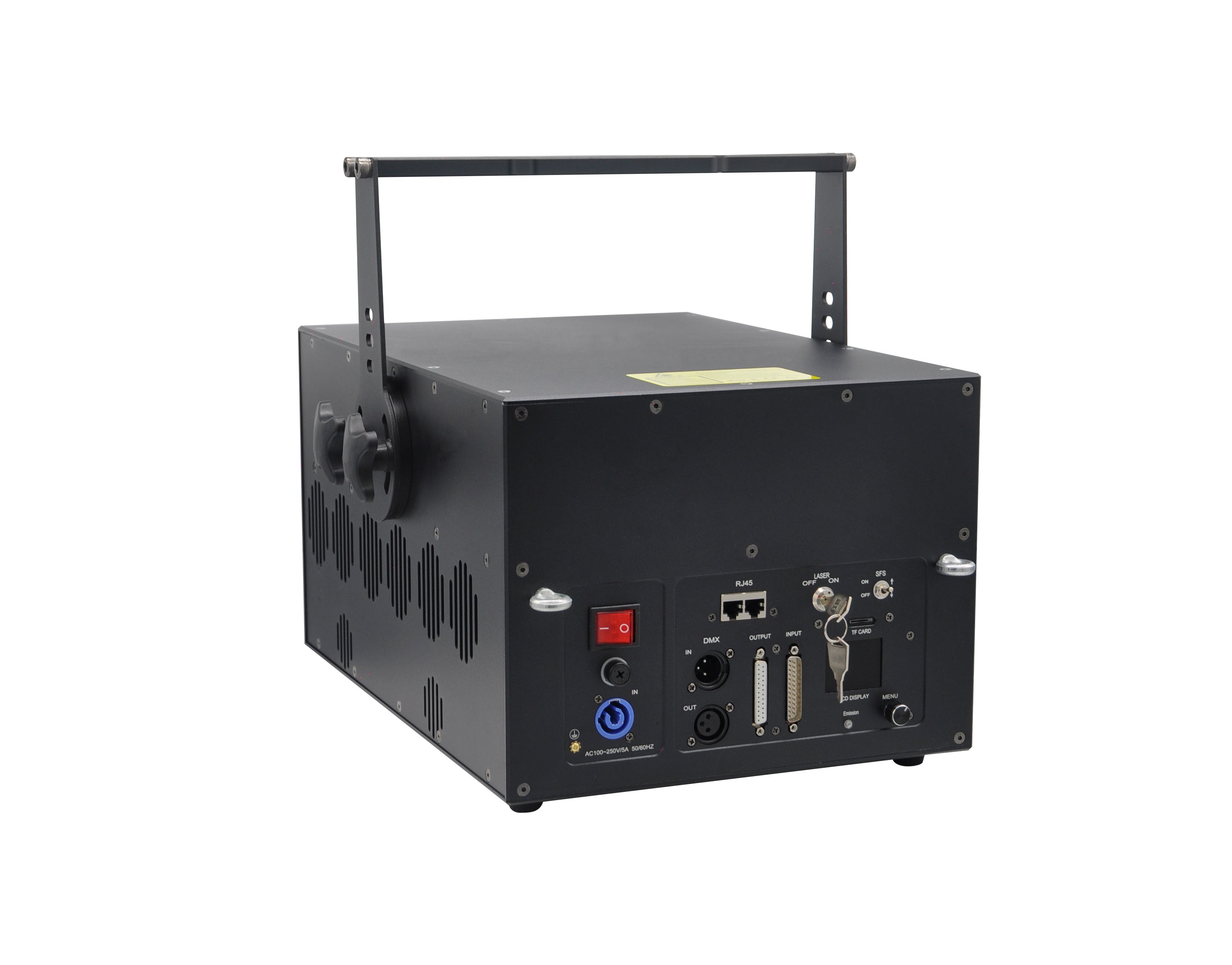 RGB analog modulation, frequency 30kHz Red light: 8000mW @ 638nm Green light: 8000mW @ 525nm Blue light: 14000mW @ 440nm |
