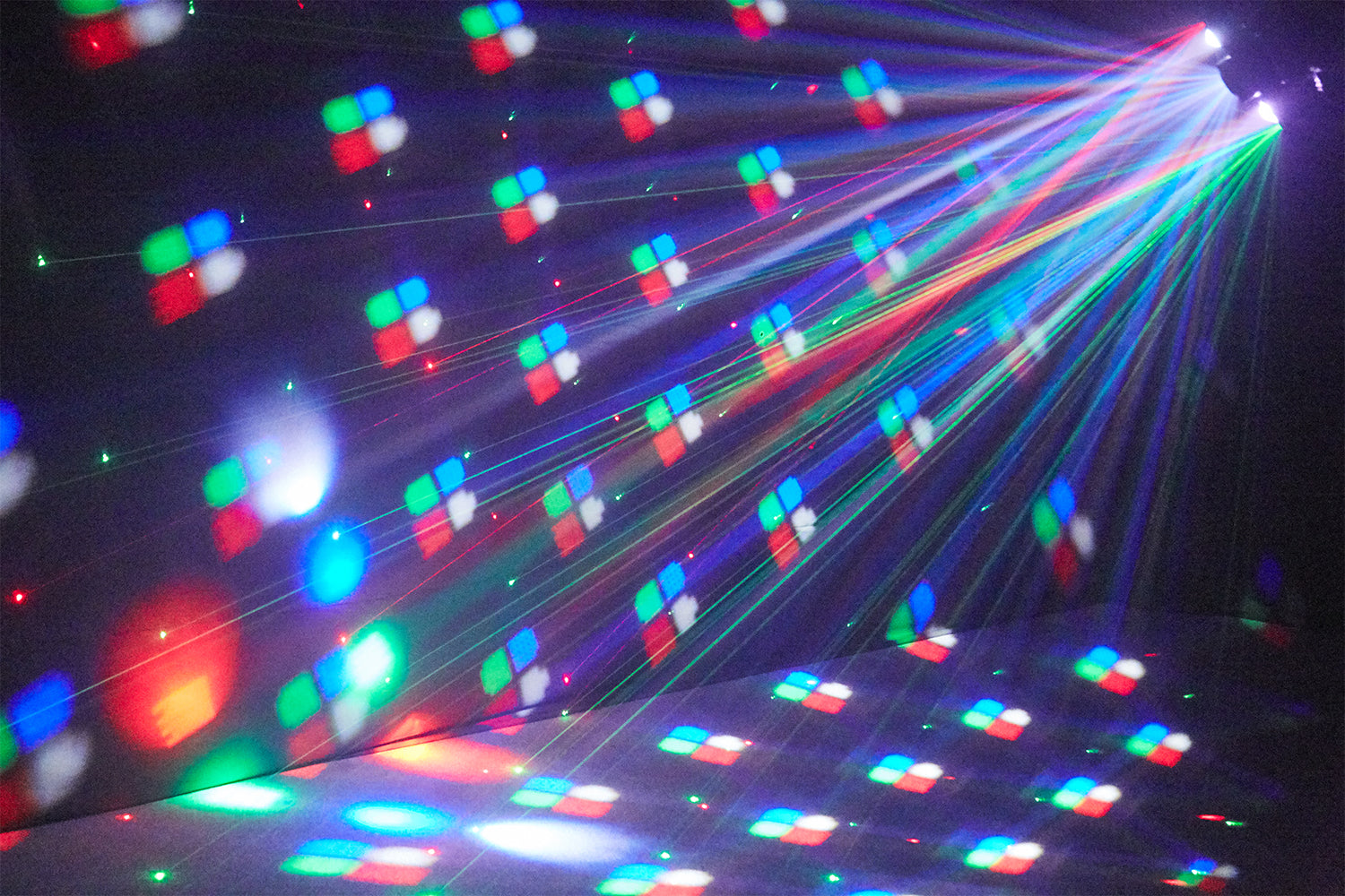 Multi-color LED and laser effects, smooth dimming, multiple control modes for small stage or event applications.